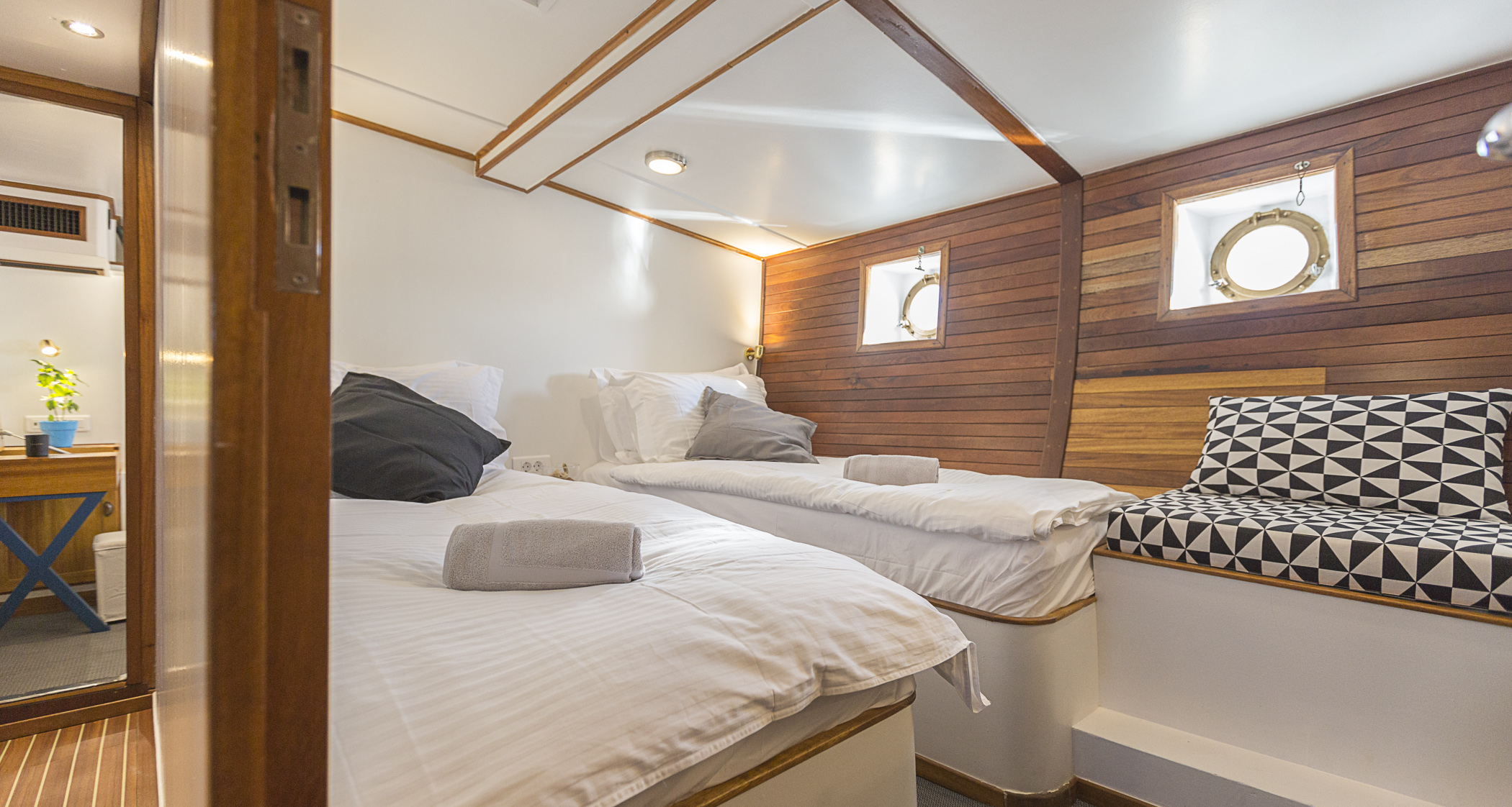 One master cabin with queen bed and indoor Jacuzzi, One VIP cabin with queen bed and large sofa, One cabin with double bed, One cabin with twin single beds