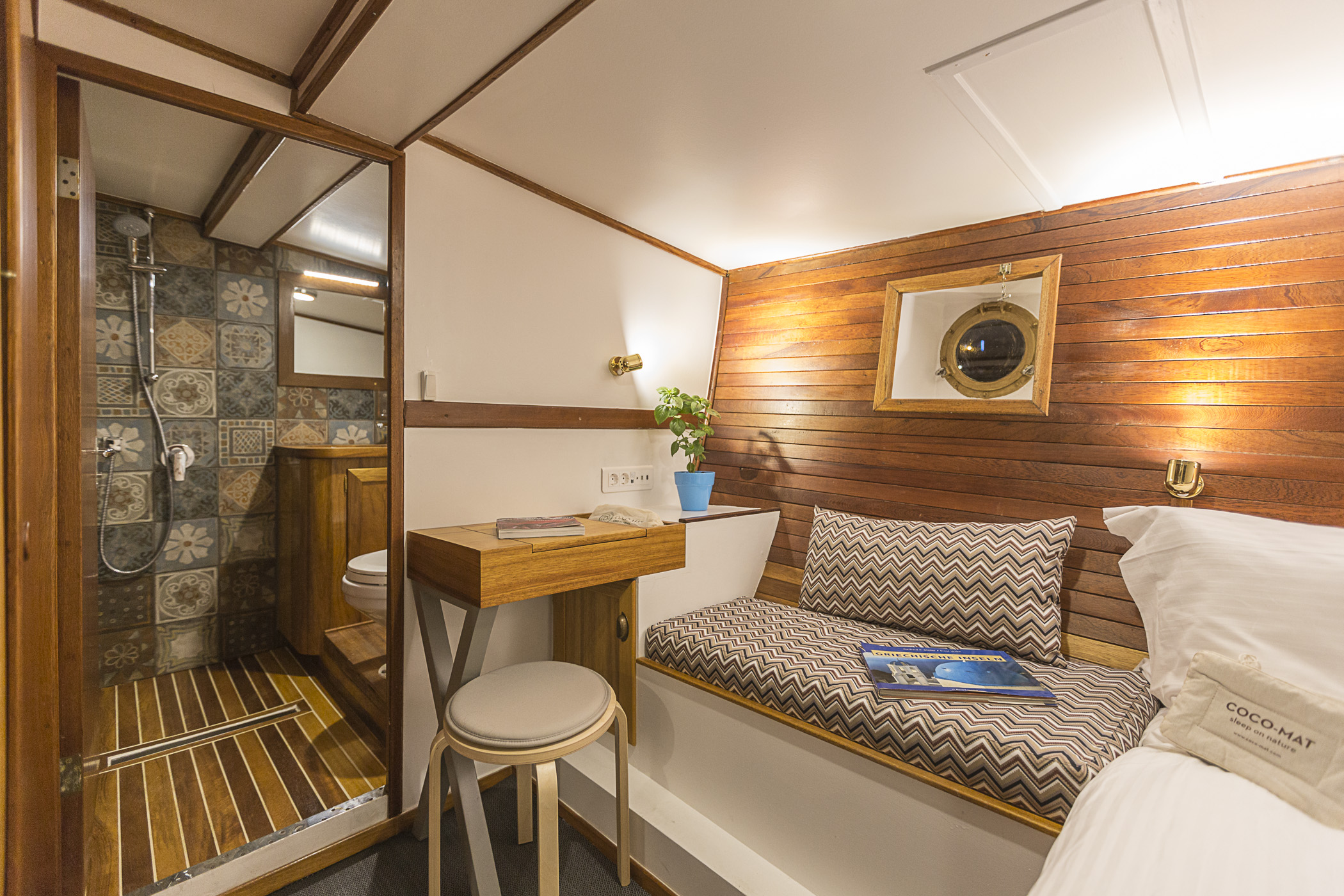 All cabins with full A/C with separate controls, deluxe en suite facilities, COCO-MAT mattresses (100% natural), Wi-Fi, Individually controlled TV, External slots for 1-/DMl, USB, Line-in, DVD, Bluetooth