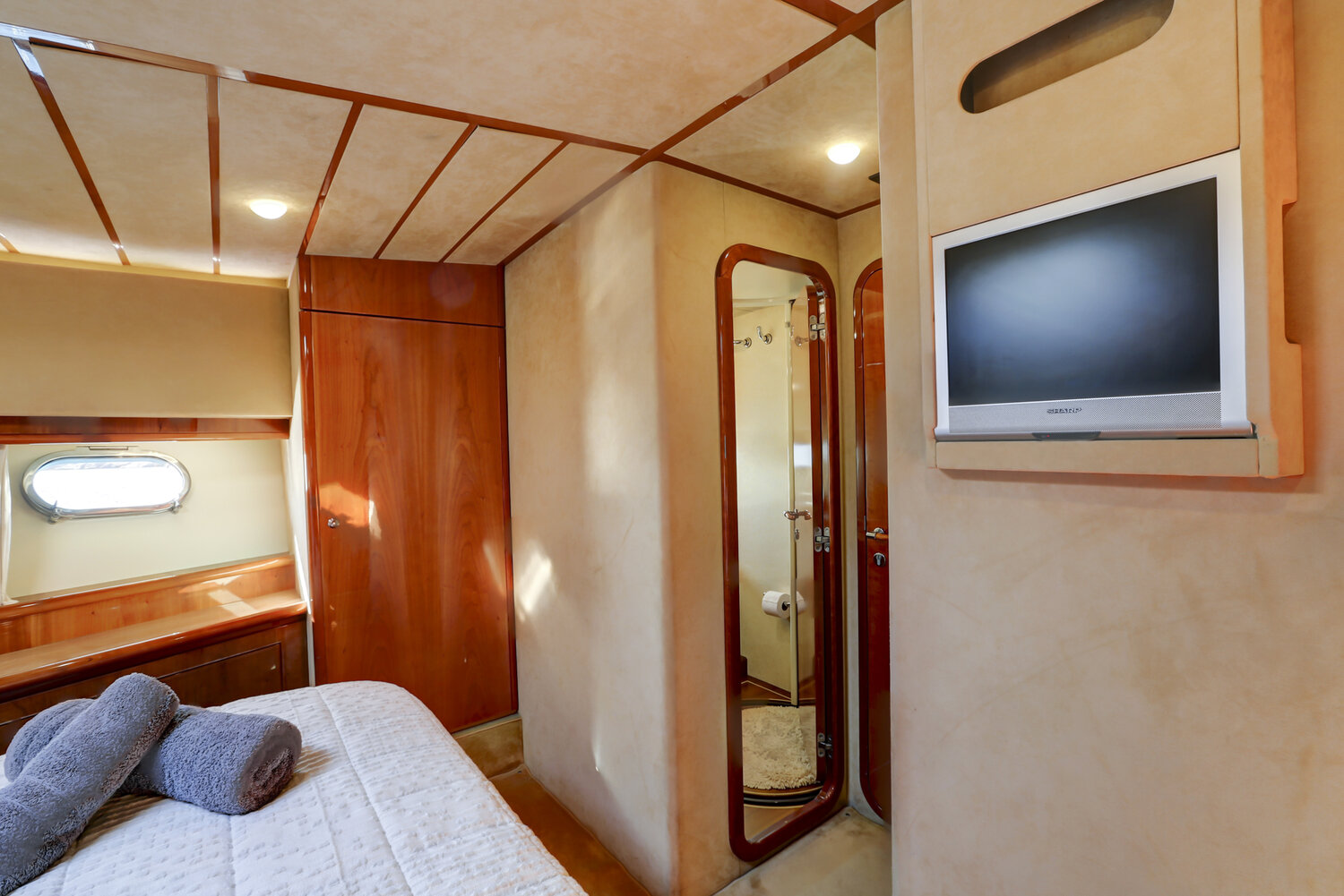 Delivered by Ferretti Yachts in 2002 and refitted in 2019, beautiful ‘Alsium’ presents a nice layout of four cabins - one Master cabin, one VIP, one twin cabin with two single beds and one twin with upper & lower beds - accommodating up to 8 guests.