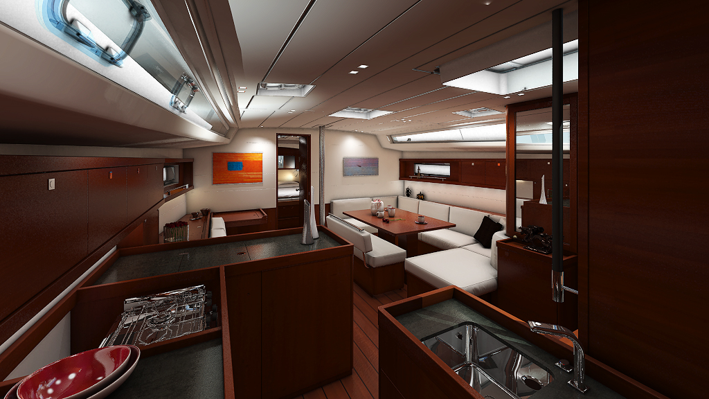 The Beneteau designers Berret Racoupeau have once again teamed up with Nauta Design to come up with something that is sophisticated, calm and comfortable. As on the Oceanis 41 & 45, the application of the continuous hull chine reduces the angle of heel when passage making and enables the cockpit to be considerably more spacious. And with that comes the electronically opening transom which when lowered creates a vast swim platform and when raised, a helmsman’s seat offering protection to the cockpit.